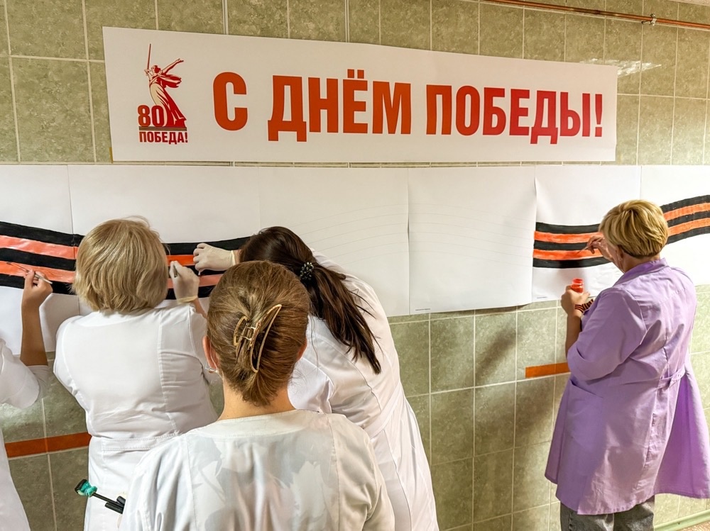 Вооружившись красками и кистями, сотрудники из всех отделений больницы превратили белые холсты в черно-оранжевый узнаваемый образ георгиевской ленточки.